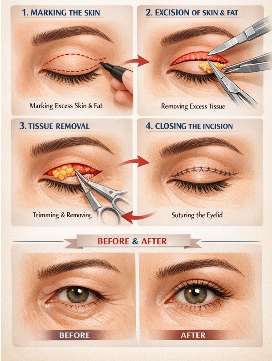Upper Blepharoplasty (Upper Eyelid Surgery): Removal of excess skin, muscle, and/or fat from the upper eyelids. Corrects droopy eyelids, reduces heaviness, and restores a more youthful eye appearance. Incisions placed in the natural eyelid crease for minimal visible scarring. Lower Blepharoplasty (Lower Eyelid Surgery): Removal or repositioning of excess fat and skin from the lower eyelids. Corrects puffiness (“eye bags”), smooths under-eye hollows, and reduces sagging. Incisions typically placed just beneath the lash line or inside the eyelid for hidden scars.